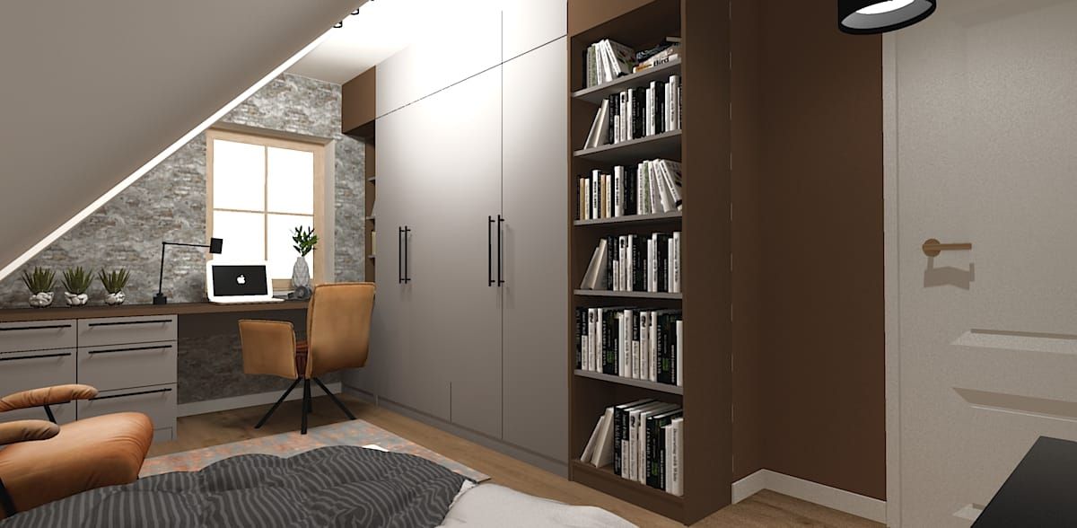 Meble to miks klasyki, vintage i boho. W salonie dominuje duża, prosta, szara sofa, zestawiona z fotelem bujanym na drewnianej ramie z plecionym siedziskiem. Stolik kawowy w formie skrzyni nadaje całości industrialnego charakteru, a czarna, ryflowana szafka RTV wprowadza nutę art-déco. Sypialnia młodzieżowa łączy szaro-zielone fronty z otwartymi regałami. Koniakowe krzesło biurowe i fotel wypoczynkowy dodają ciepła i charakteru, przełamując chłodne szarości. W łazience pojawia się biała zabudowa z frezowanymi frontami i drewnianym blatem w stylu Hampton – połączenie klasyki i świeżości.