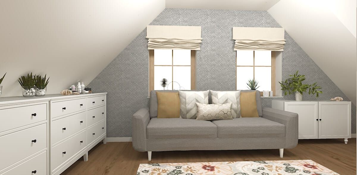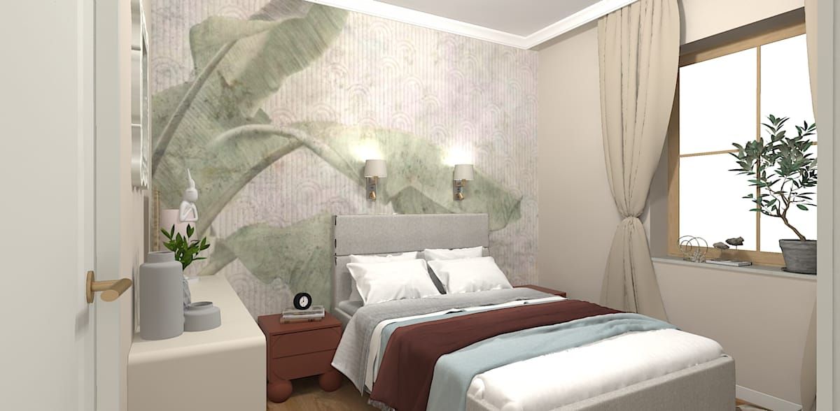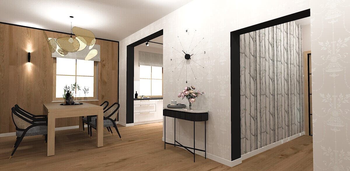Wnętrza są jasne, świeże i bardzo indywidualne. Od pierwszego spojrzenia uwagę przyciągają różnorodne faktury i wzory. Spokojna beżowo-szara baza w części dziennej stanowi tło dla botanicznych i geometrycznych tapet, które dodają dynamiki i lekkości. Duży nacisk położono na naturalne materiały – drewno, rattan i miękkie tkaniny – dzięki czemu całość zyskała przytulny, niemal boho-charakter. To wnętrze, które łączy spokój klasyki z twórczą swobodą eklektyzmu.