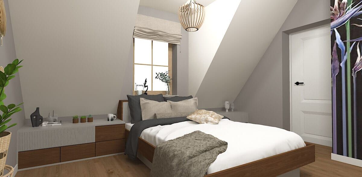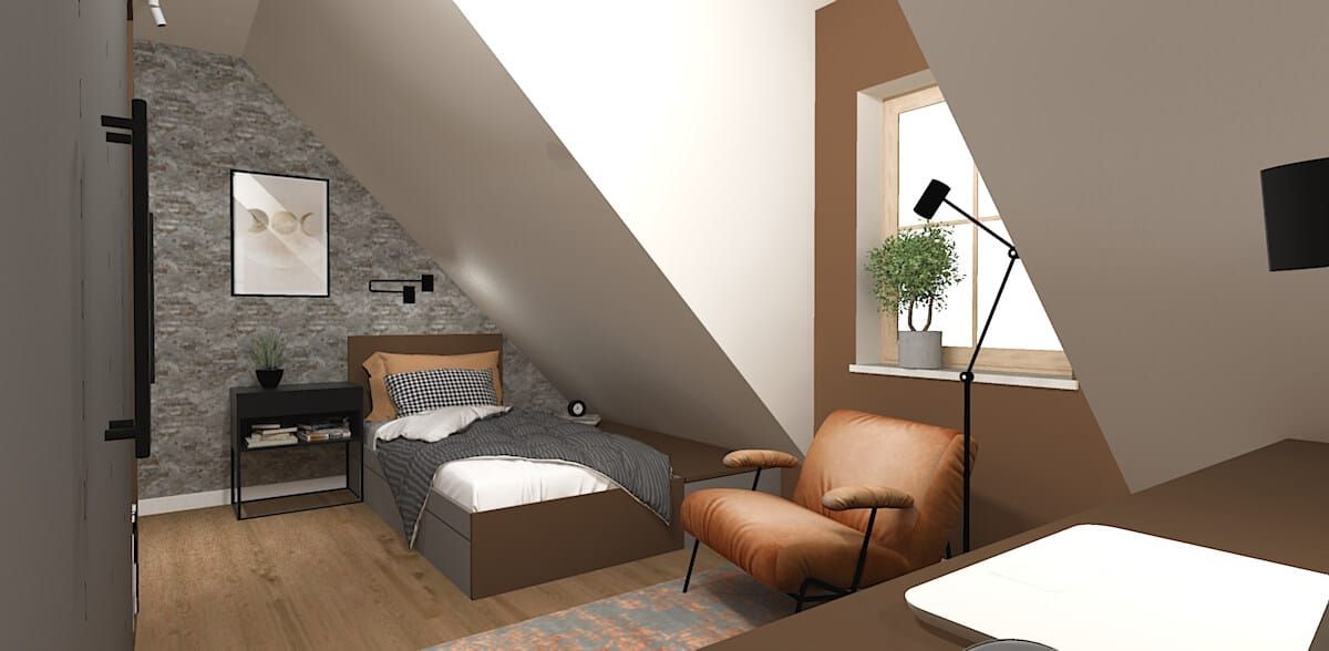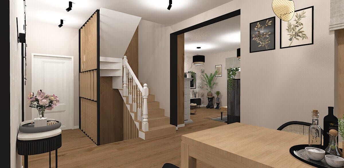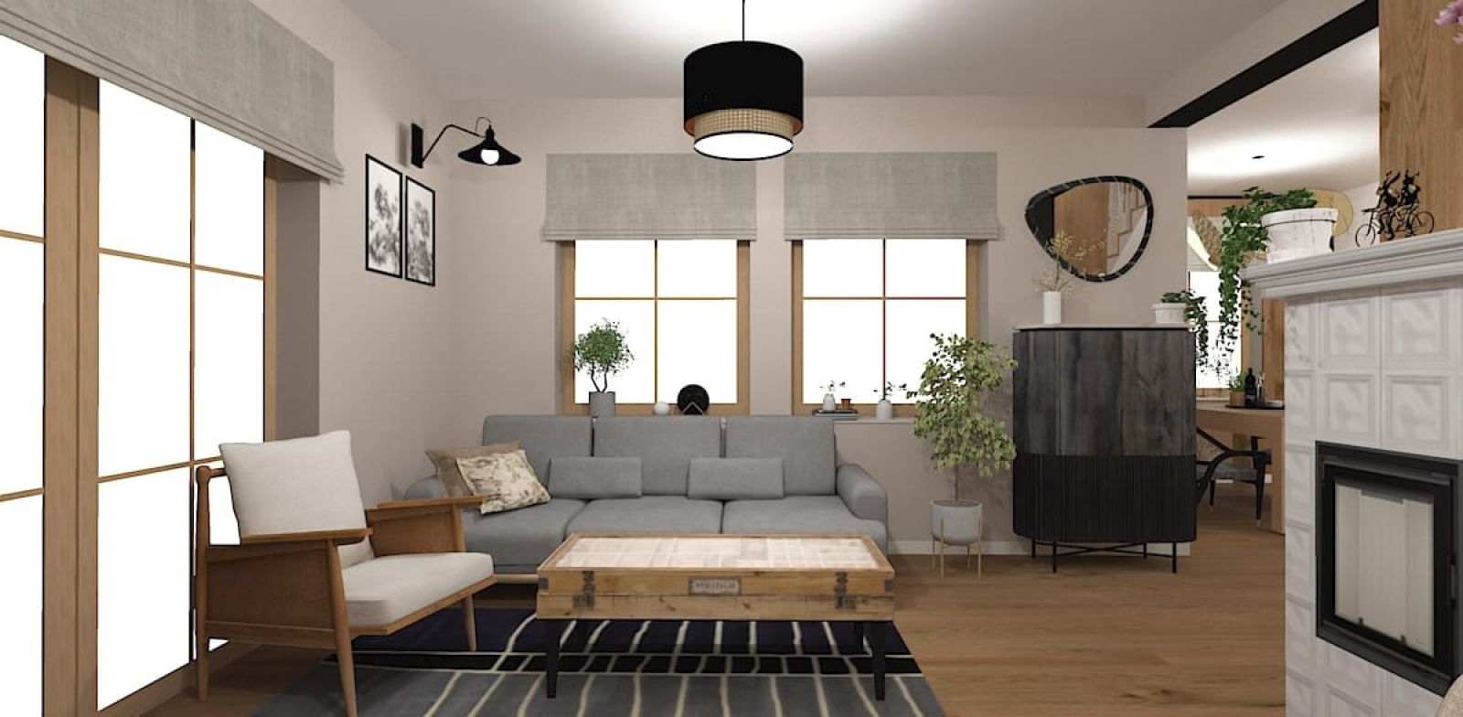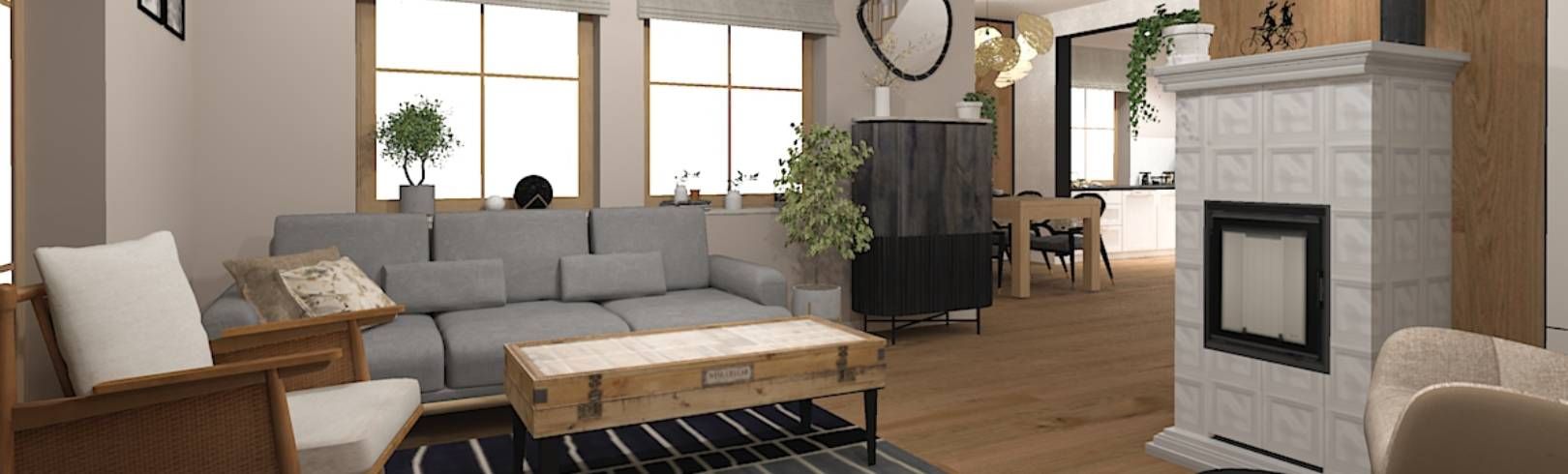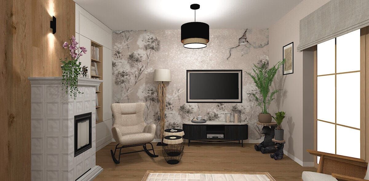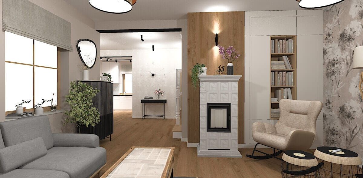 Podstawą projektu było stworzenie stylu eklektycznego opartego na prostości i harmonii. Neutralne ściany, drewniane podłogi i delikatne ramy mebli stanowią klasyczne tło dla śmielszych akcentów. Na tej bazie wyróżniają się rustykalny piec kaflowy, boho-tapety botaniczne, vintage’owe fotele bujane i industrialne stoliki. Poddasze kontynuuje tę różnorodność – od terakotowo-brązowej sypialni przez skandynawski pokój dzienny, aż po egzotyczny akcent z fototapetą w liście bananowca. Całość jest spójna w nastroju, mimo świadomego zestawienia różnych stylów.