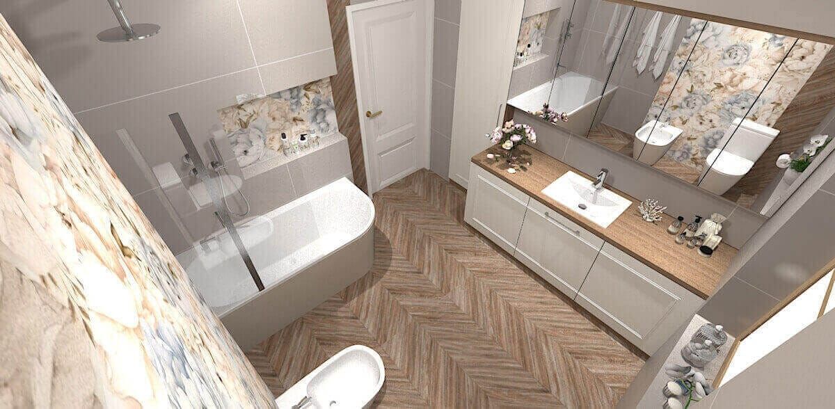 Nowy dom z pięknym ogrodem różanym, zaprojektowany dla młodego Państwa ceniącego bliskość natury i estetykę codzienności. We wnętrzach musiały oczywiście pojawić się motywy kwiatowe – na płytkach w łazience, tapetach i fototapecie w salonie. Przeplatają się tu elementy klasyczne – sztukaterie, balustrady, kaflowy kominek – z nowoczesnymi, prostymi rozwiązaniami. Trzecim tonem aranżacji jest boho – rattanowe lampy, naturalne tkaniny i ciepłe drewno, które dopełniają tę eklektyczną, harmonijną kompozycję.