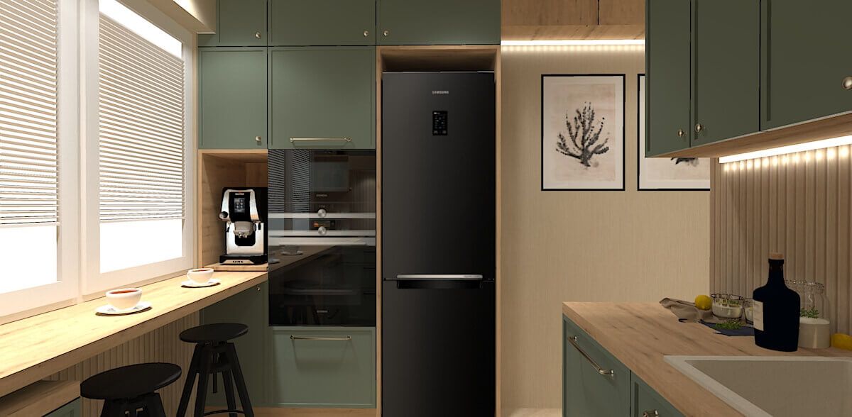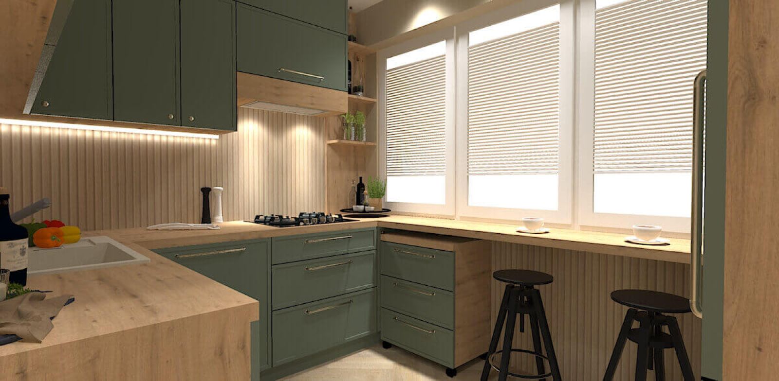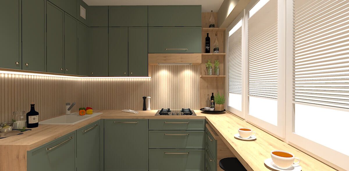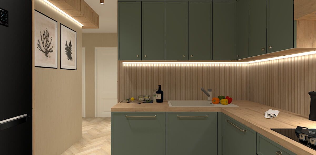Wnętrze już od progu sprawia wrażenie jasnego, uporządkowanego i harmonijnego. Zastosowanie drewnianych lameli, roślin i miękkich tkanin wprowadza ciepło i przytulność, łagodząc nowoczesny minimalizm form. Kuchnia w odcieniu szałwiowej/butelkowej zieleni stanowi wyrazisty punkt całej aranżacji – jest świeża, elegancka i spójna z motywem „Green”. Całość utrzymano w neutralnej bazie kolorystycznej – biel, beż i jasne drewno – co pozwala zieleni wybrzmieć jako przewodni akcent.