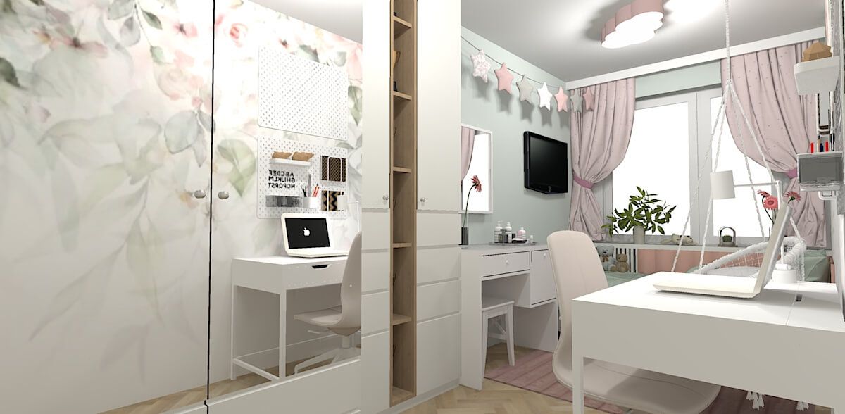Projekt opiera się na funkcjonalnym układzie pomieszczeń i maksymalnym wykorzystaniu naturalnego światła. Szeroki, otwarty korytarz płynnie prowadzi do kuchni i salonu, tworząc przyjazne, przestronne przejście między strefami. Kuchnia w kształcie litery „U” została wyposażona w blat barowy pod oknem, który pełni rolę zarówno stołu, jak i miejsca do porannej kawy. Salon łączy w sobie strefę relaksu i pracy – duża sofa i biurko wkomponowane w zabudowę tworzą funkcjonalną całość. Sypialnia rodziców zorganizowana jest w podobny sposób – obok łóżka znalazło się drugie stanowisko pracy. Trzy pokoje dziecięce są spersonalizowane – zgodnie z życzeniami ich małych właścicieli, którzy okazali się wyjątkowo wymagającymi „gwiazdami” tego projektu.