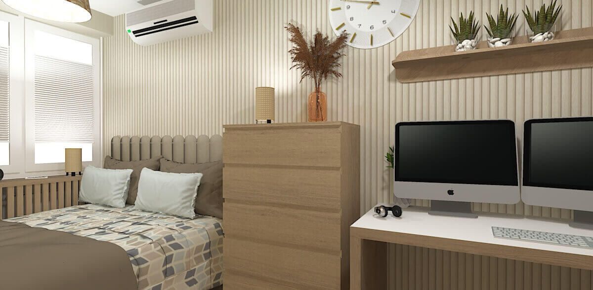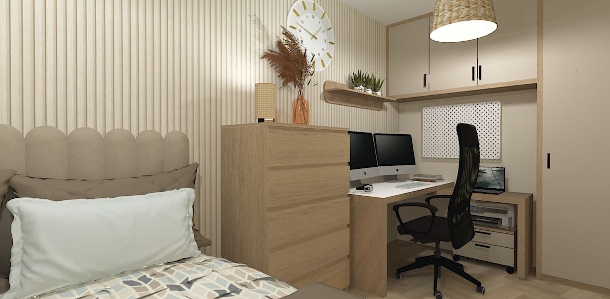Meble zaprojektowano tak, by łączyły prostotę z funkcjonalnością. W kuchni zastosowano fronty w ciemnej zieleni, gładkie i matowe, zestawione z drewnianymi blatami i naturalnymi akcentami. Wzdłuż okna umieszczono blat barowy z hokerami, który stanowi dodatkową przestrzeń do pracy i posiłków. W salonie znajduje się modułowa szara sofa, zabudowa meblowa z biurkiem oraz stoliki i komoda z rattanowymi elementami, które ocieplają nowoczesny wystrój. Sypialnia główna utrzymana jest w beżach i drewnie – z tapicerowanym zagłówkiem i panelami ściennymi z lameli. Zabudowa łączy w sobie szafę, komodę i biurko, tworząc spójną całość. Pokoje dzieci wyposażono w meble z IKEA – praktyczne, łatwe do modyfikacji i kolorystycznie dopasowane do charakteru każdego pokoju.
